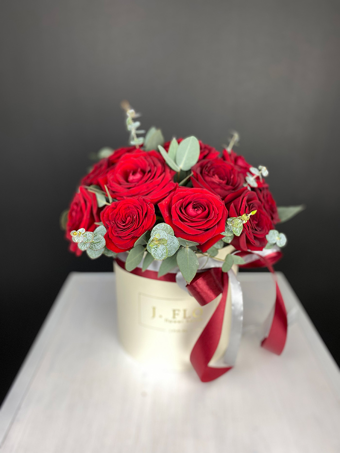 Красные розы собраны в плотную округлую форму и помещены в цилиндрическую коробку. Эвкалипт добавляет свежести и завершает композицию.