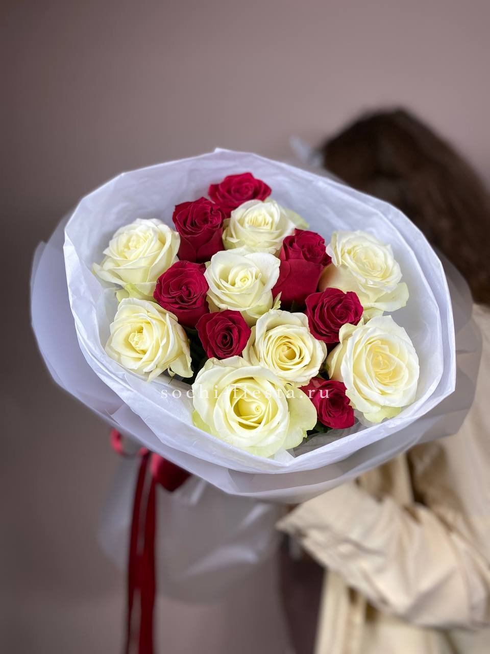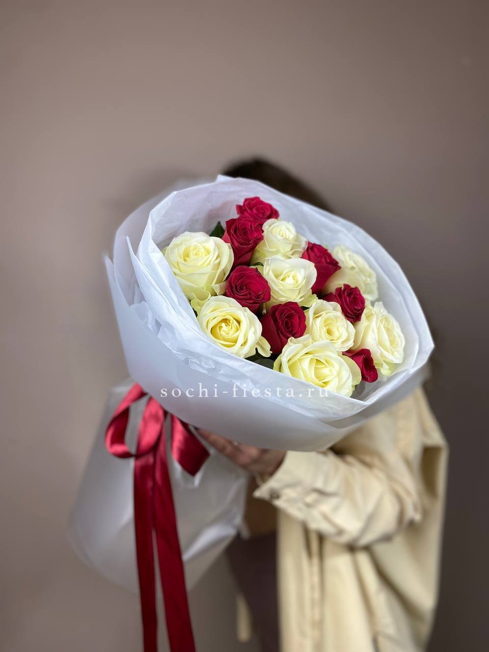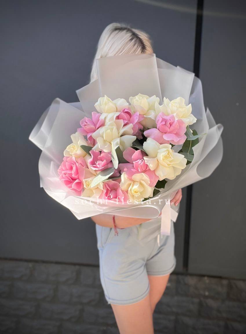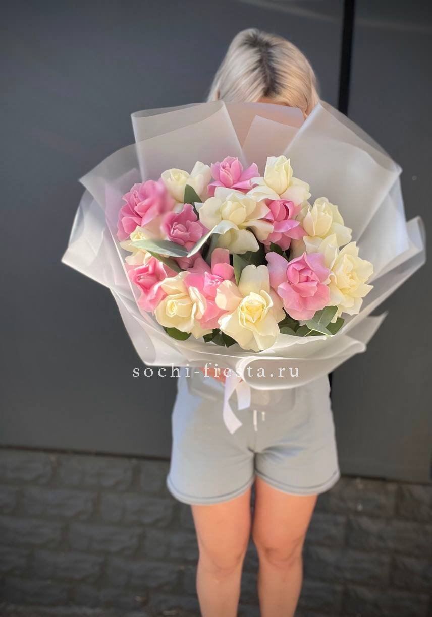 Длинные стебли и крупные бутоны в палитре микс создают букет с графичным силуэтом. Сто одна роза выстраивается в плотную композицию с выразительной вертикалью.