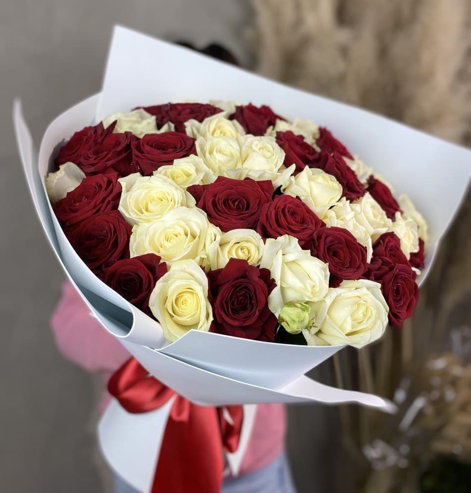 Белые и красные розы переплетаются в динамичной игре света и тени. Двадцать семь бутонов создают живописный рисунок, где каждый цвет усиливает звучание другого без лишних слов.