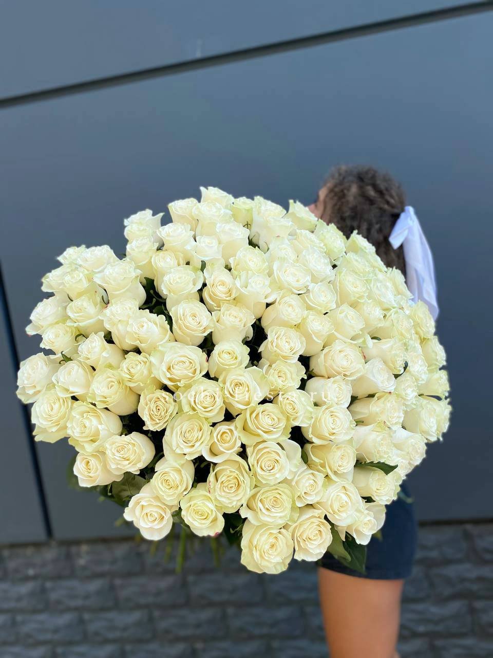 Сто один высокий стебель формирует внушительную композицию с безупречной геометрией. Белые головки на длинных ножках создают визуальный эффект монументальности. Присутствие, которое невозможно не заметить.