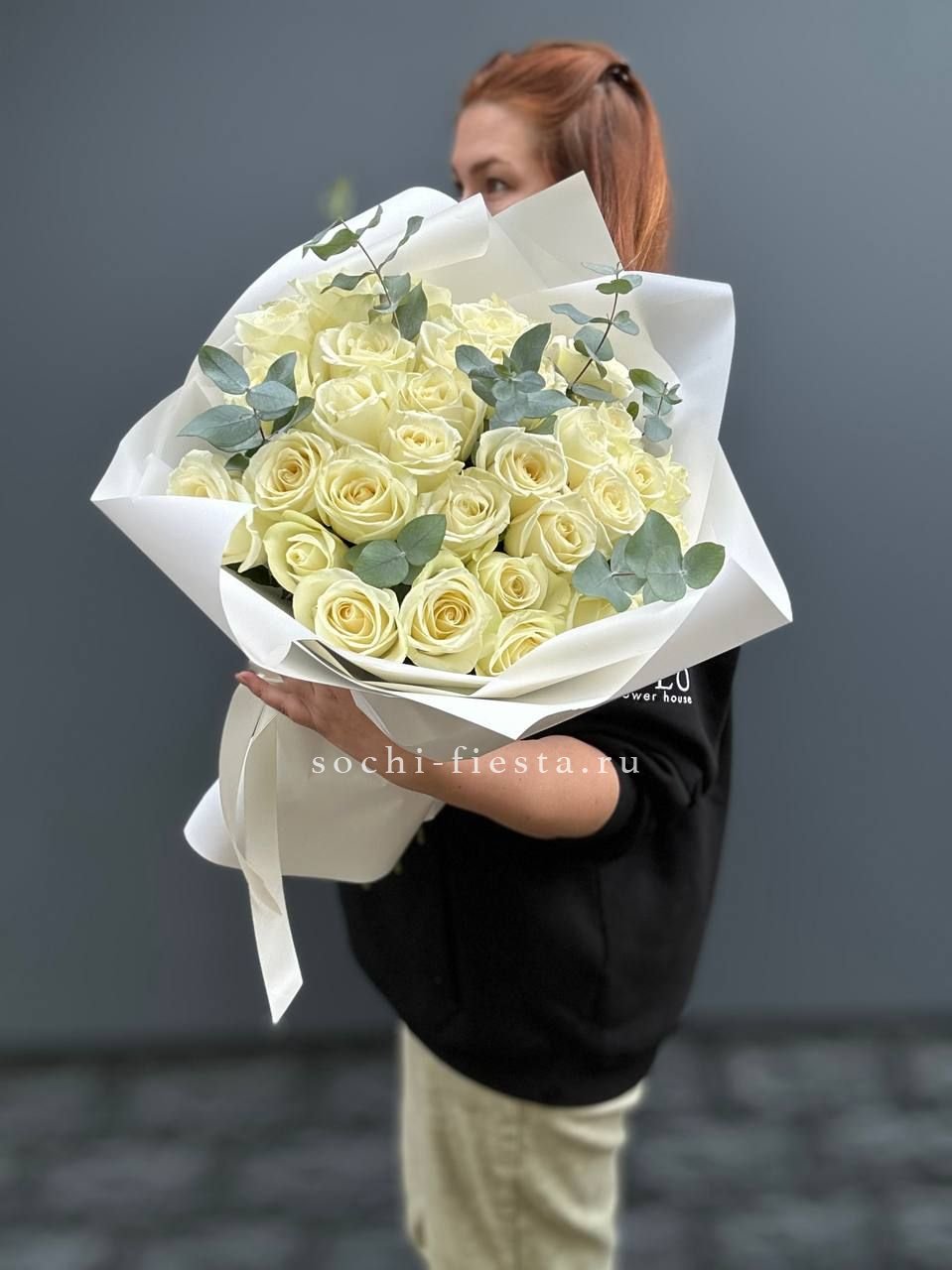 Вывернутые лепестки открывают внутреннюю архитектуру каждого бутона и придают букету скульптурную выразительность. Эвкалипт вплетается между цветами, добавляя воздуха и свежести общей композиции.