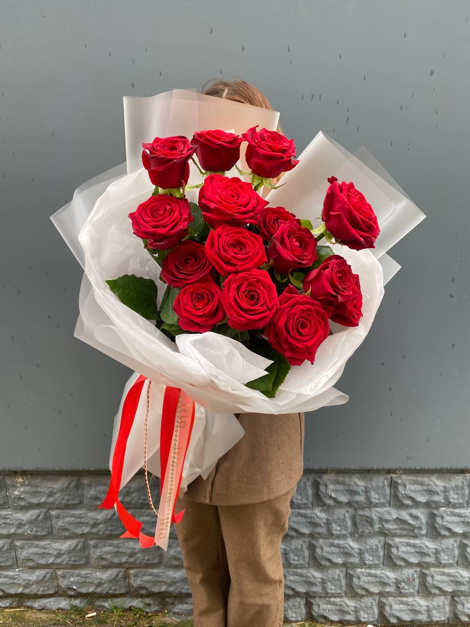 Пятнадцать красных роз в лаконичной упаковке держат безупречную вертикаль и собраны так плотно, что линия букета остаётся чёткой и графичной. Форма читается с любого угла и не теряет выразительности даже в высоких вазах.