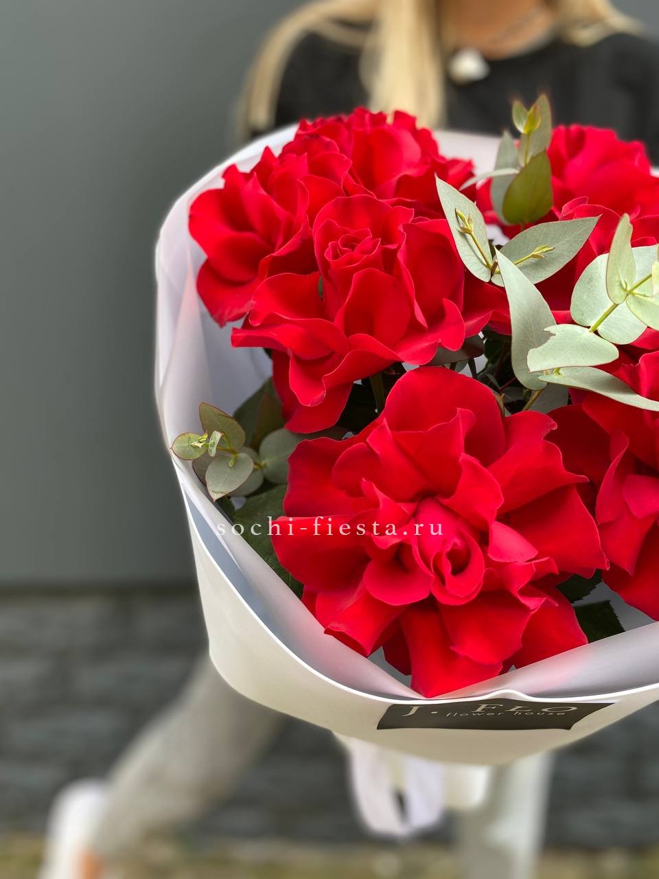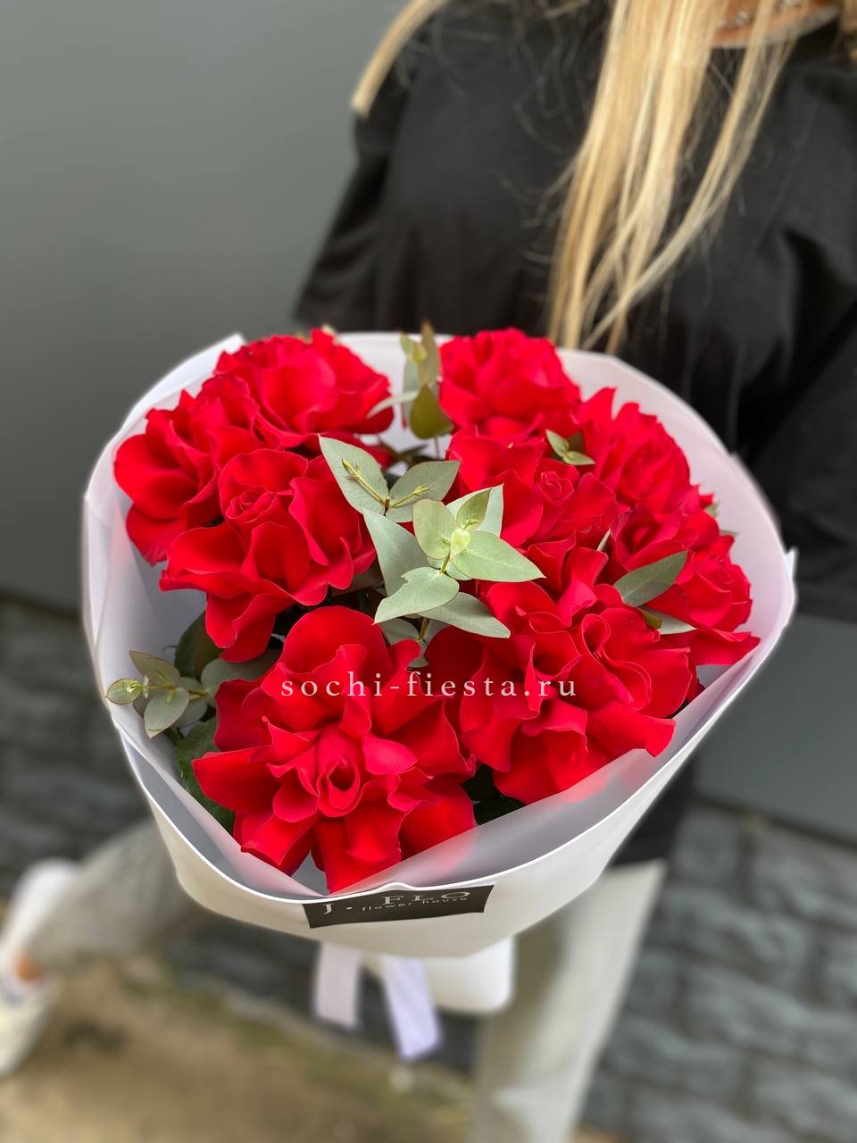 Классическая красная гамма в масштабной подаче. Тридцать семь стеблей формируют округлую композицию с четким силуэтом. Букет занимает пространство и сразу привлекает внимание.