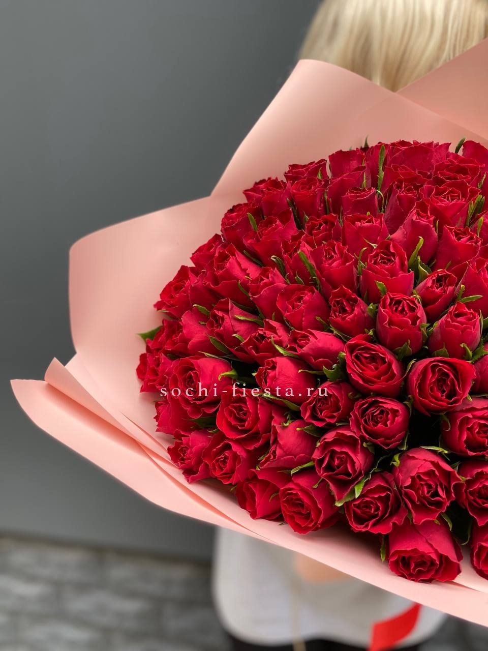 Сто одна красная роза хорошо сохраняет форму и долго радует свежестью бутонов. Плотная сборка обеспечивает аккуратный вид и удобство размещения в любом интерьере.
