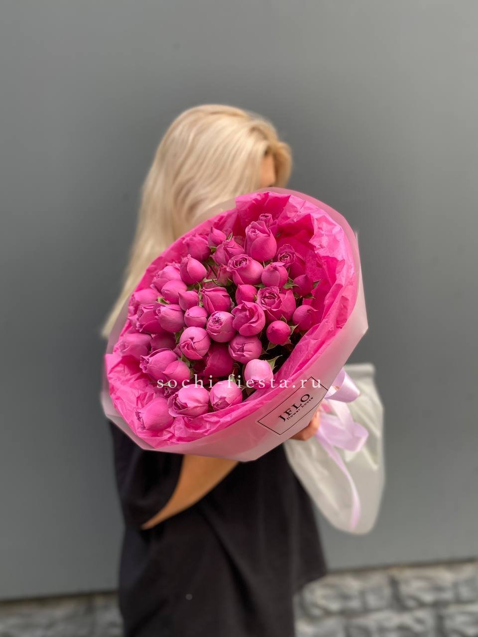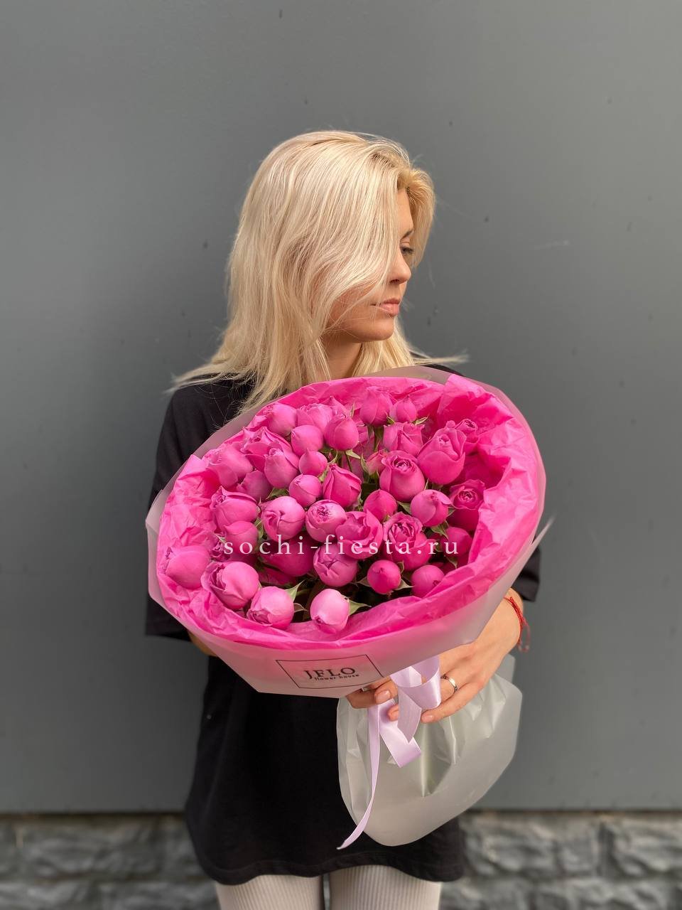 25 пионовидные кустовые розы,  хлопок, лента, дизайнерская упаковка.