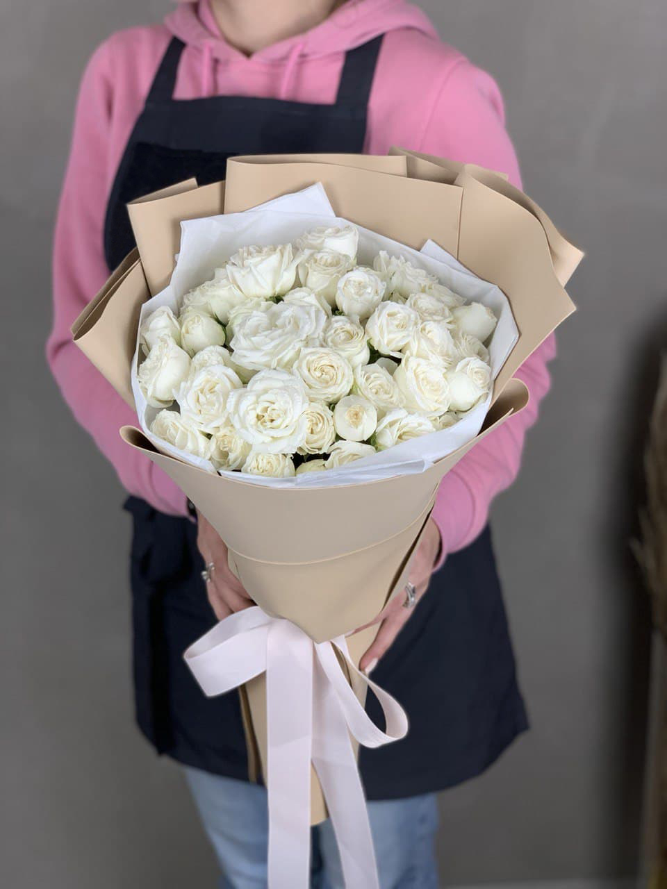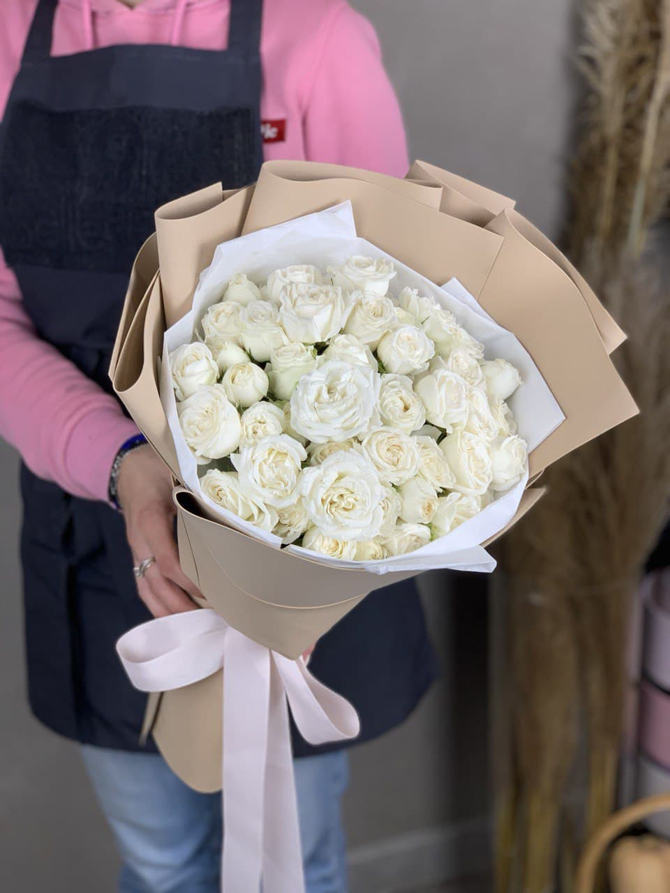 Двадцать пять пионовидных кустовых роз с коробочками хлопка в дизайнерской упаковке. Природная белизна и пышные головки создают объём с мягкими переходами.