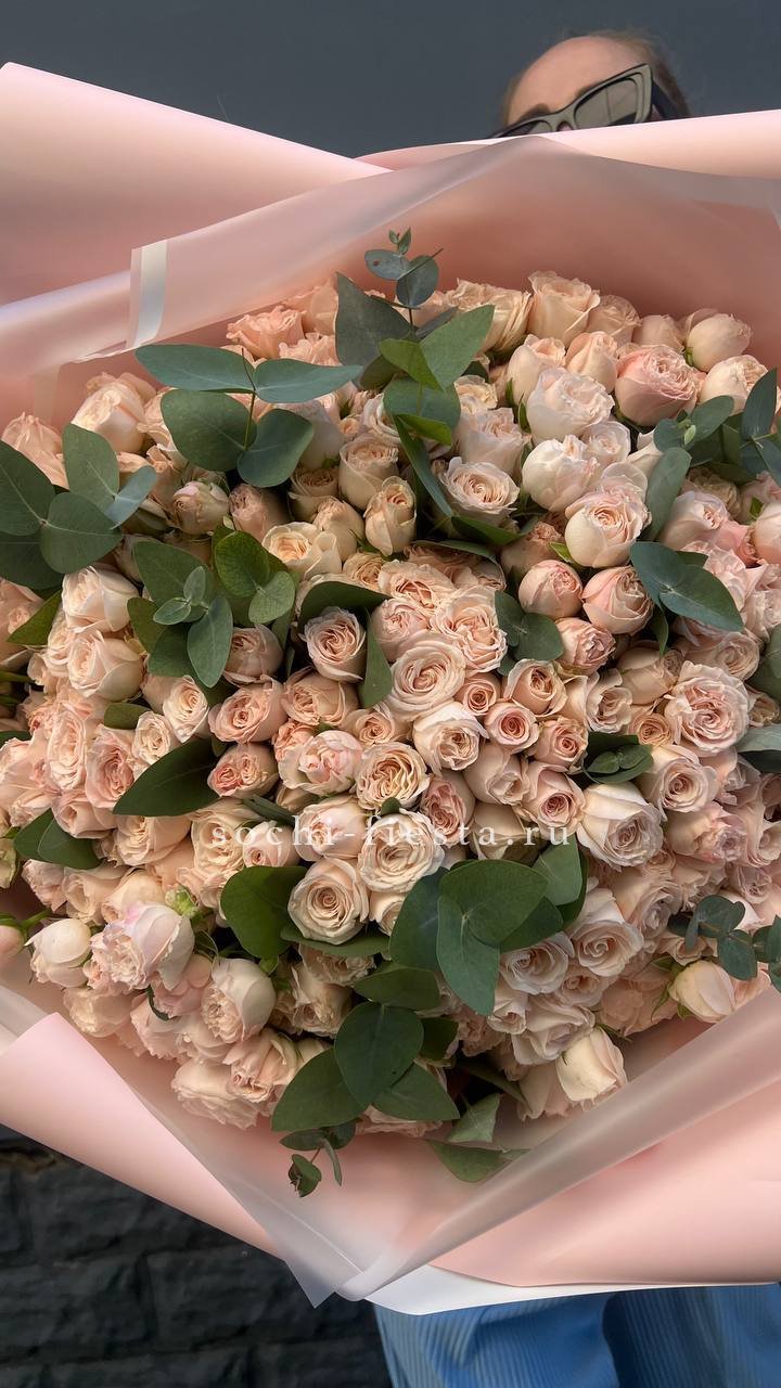 Сто одна кремовая кустовая роза дополнена ветками эвкалипта, который добавляет серебристые нотки и графичность линий. Крупная композиция притягивает внимание своим масштабом и спокойной цветовой гаммой.