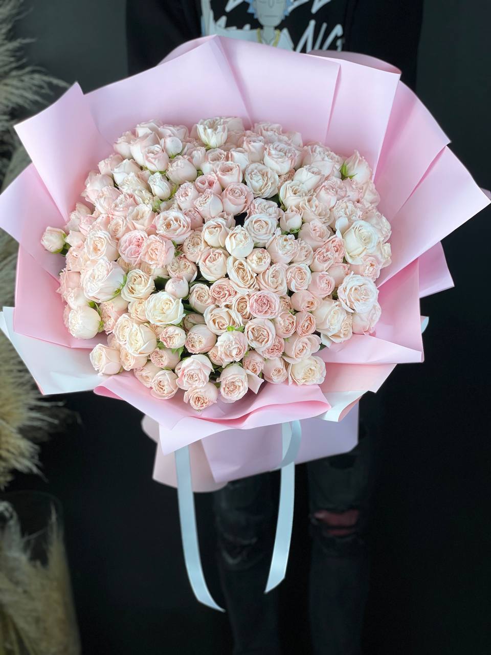 Пятьдесят одна кустовая роза собрана в плотный купол с множеством мелких бутонов на каждой ветке. Пышная композиция с ветками эвкалипта создает объемную форму и наполняет пространство свежестью. Яркий жест для тех, кто ценит масштаб и щедрость