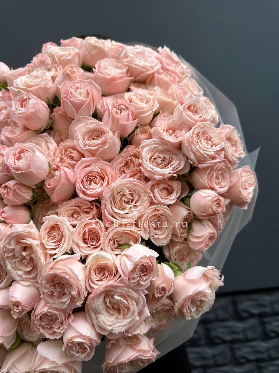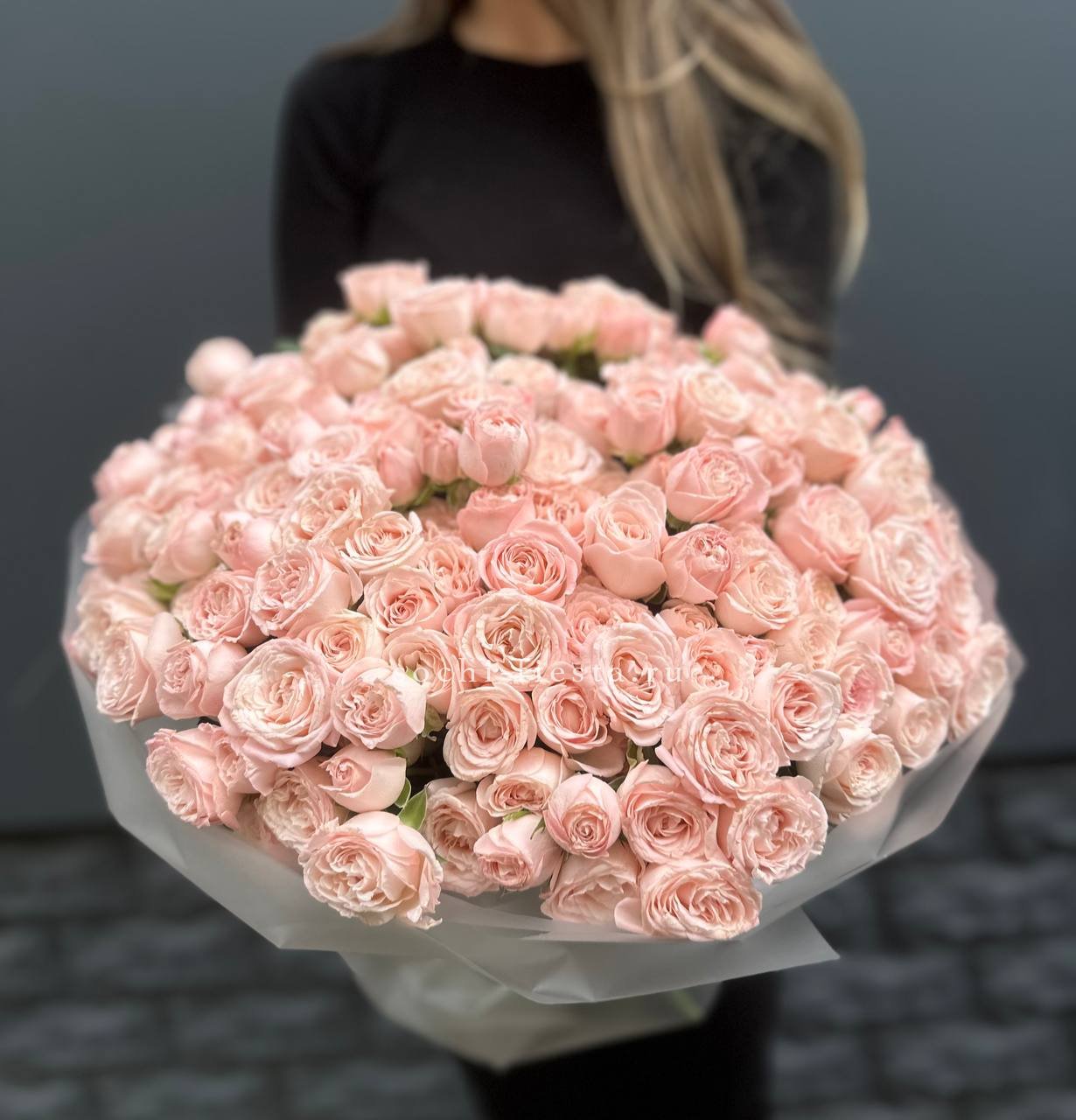 Свежий букет с множеством мелких бутонов образует воздушное облако. Кустовые розы собраны так, что композиция кажется легкой и подвижной, словно только что сорвана в саду.