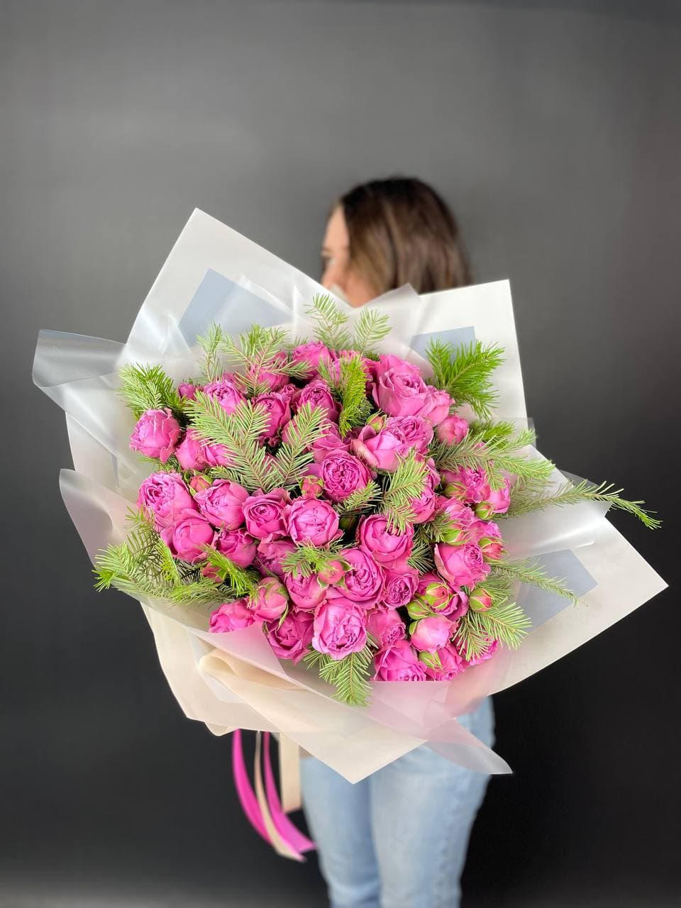 роза Мисти Баблс, ветки нобилиса, лента, дизайнерская упаковка.