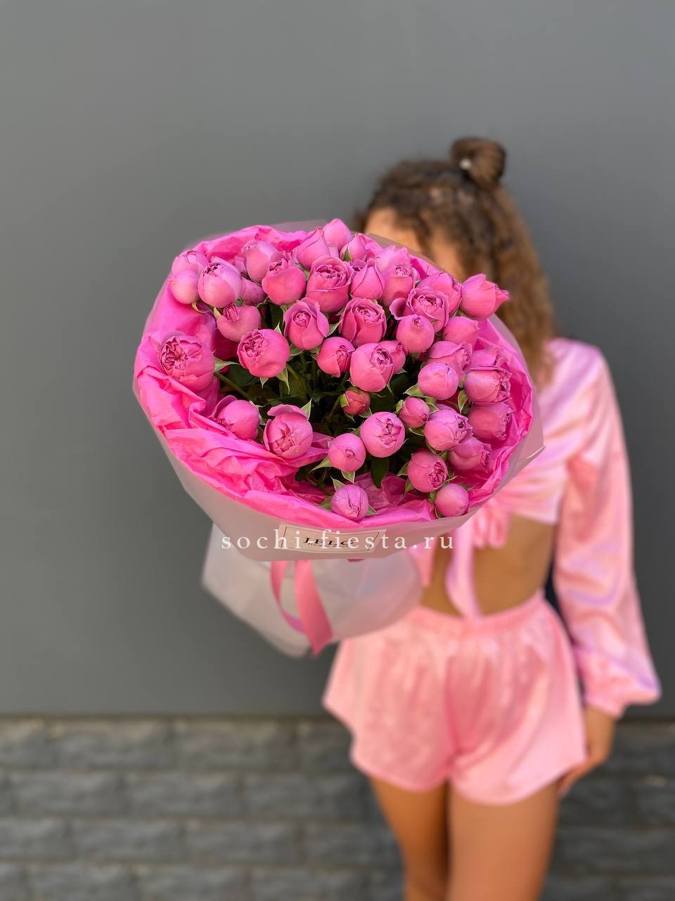 Двадцать пять пионовидных роз в плотной округлой форме создают объёмное облако нежно-розового оттенка. Сорт Pink X-Pression с густомахровыми бутонами собран под ленту без дополнительного декора.