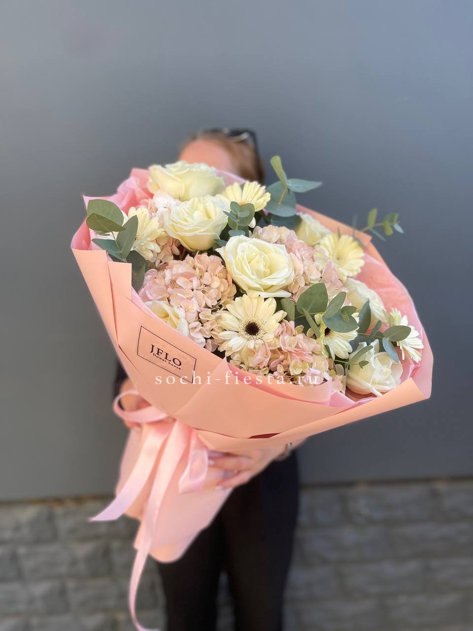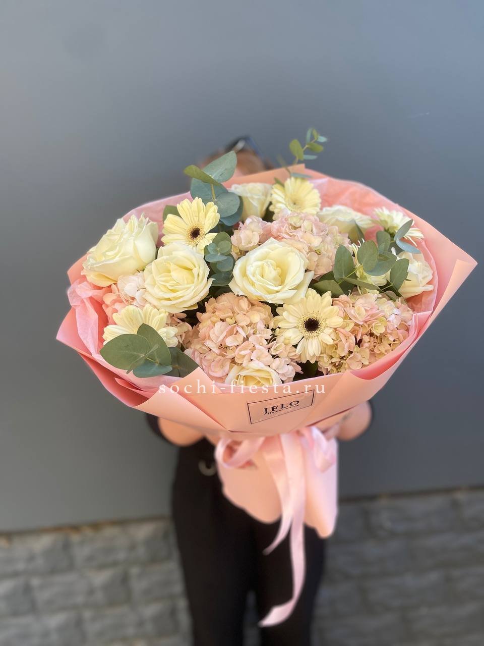 гортензия, розовые розы, диантусы, эустома, маттиолы, эвкалипт лента и дизайнерская пленка.