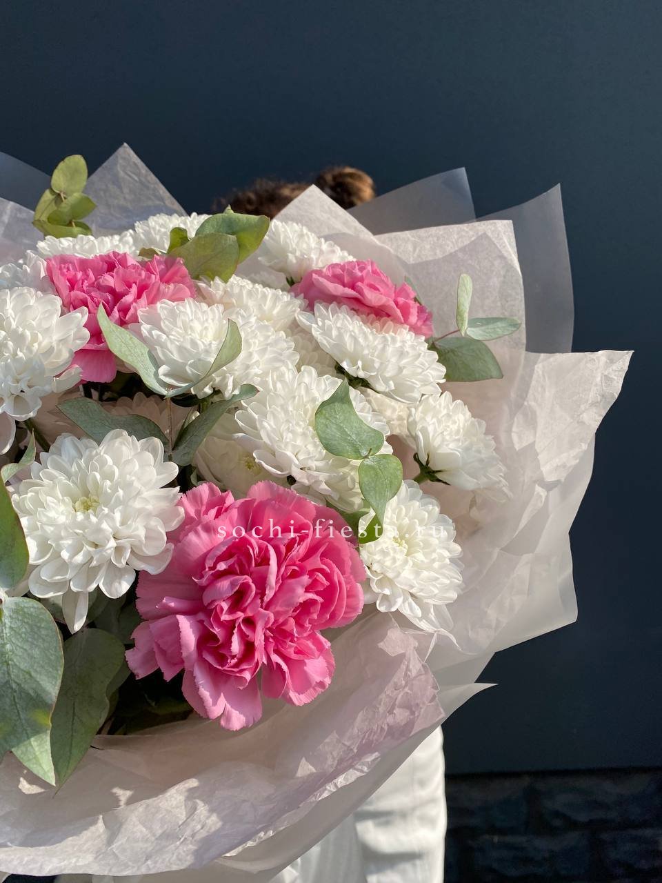 Воздушные соцветия кустовой хризантемы чередуются с яркими головками диантусов. Эвкалипт обрамляет букет серебристой зеленью, создавая лёгкое и свободное настроение.