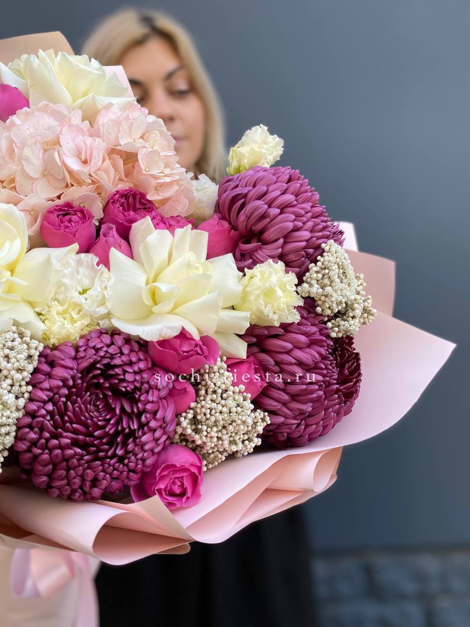 бигуди, гортензия, мисти баблс, розы, эустома, озотамус в нежном оформлении.