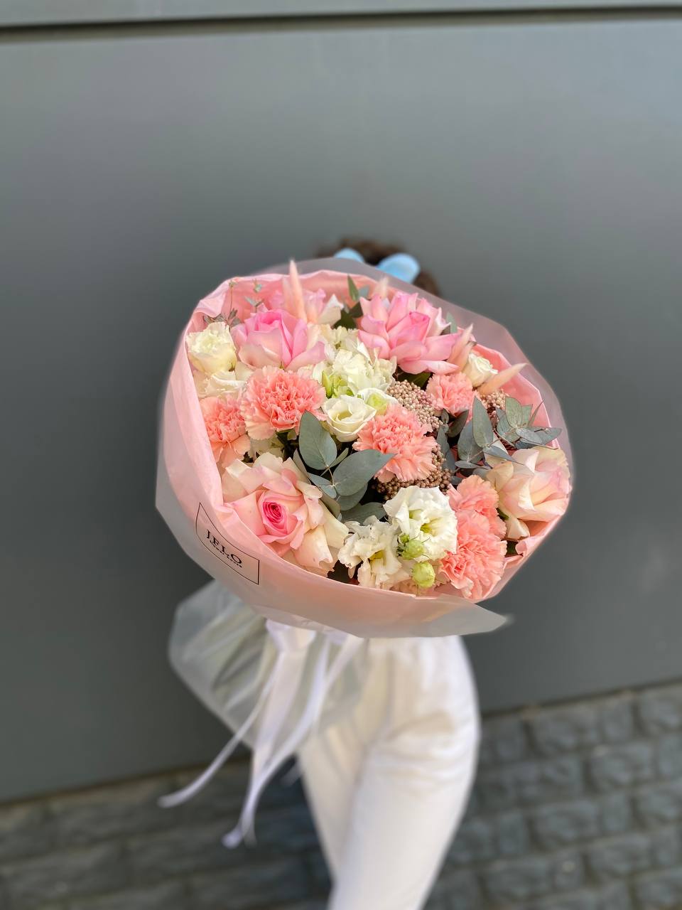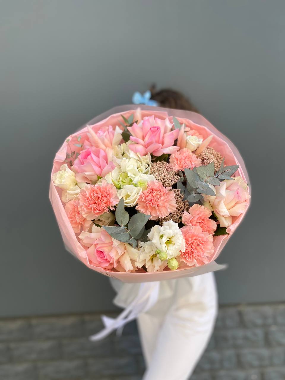 Розовые розы и диантусы окружены пышными соцветиями маттиолы и бомбастика. Композиция собрана плотно, каждый цветок поддерживает соседний, создавая объемную округлую форму. Букет держит силуэт и выглядит цельно с любого ракурса.