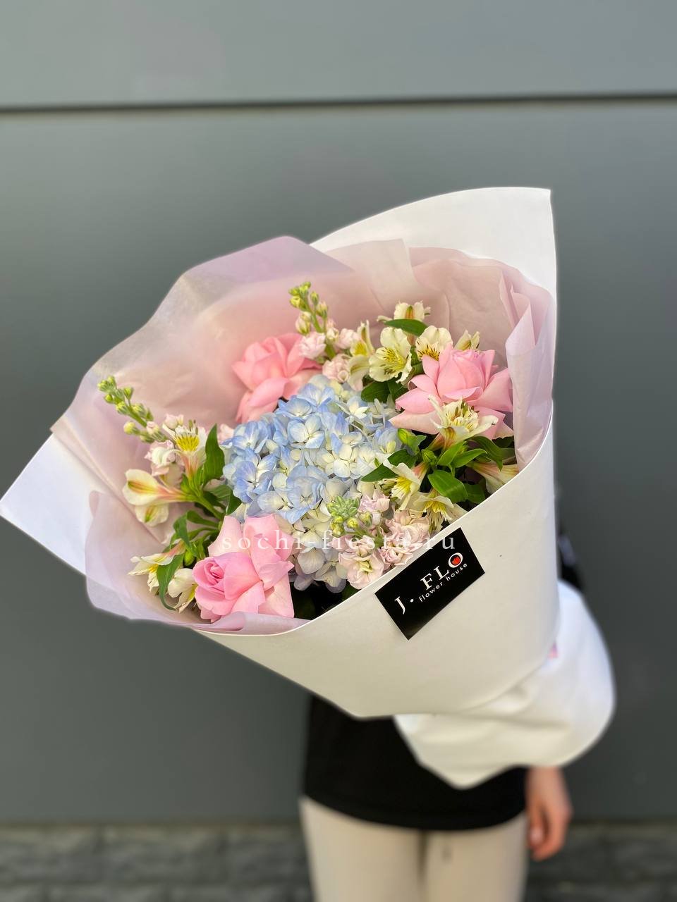 розовая роза, диантус, бомбастик, маттиола в нежном оформлении.