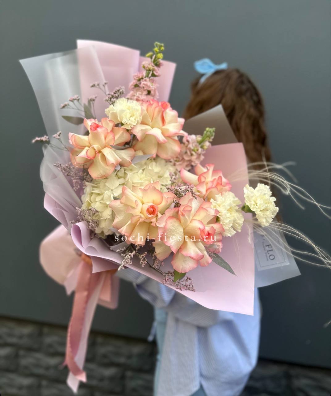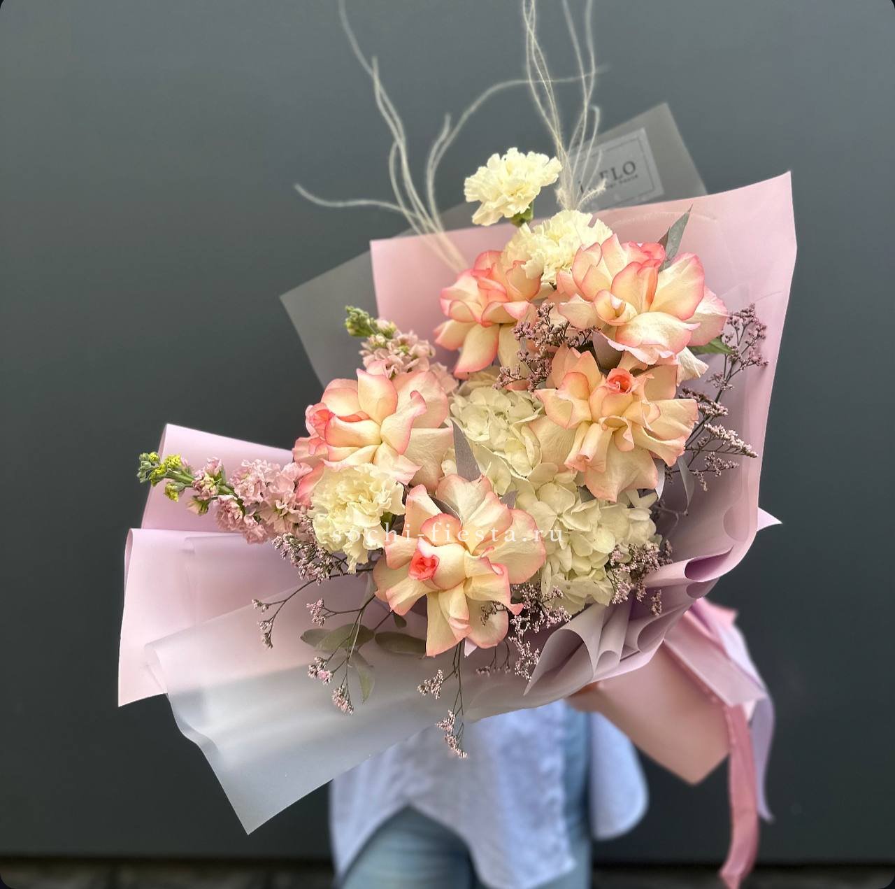 Воздушная композиция в пастельных тонах с пионовидными розами и гортензией создает объемную форму. Каждый бутон раскрывается слоями, а диантусы добавляют графичные точки среди крупных соцветий.