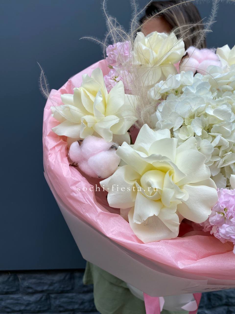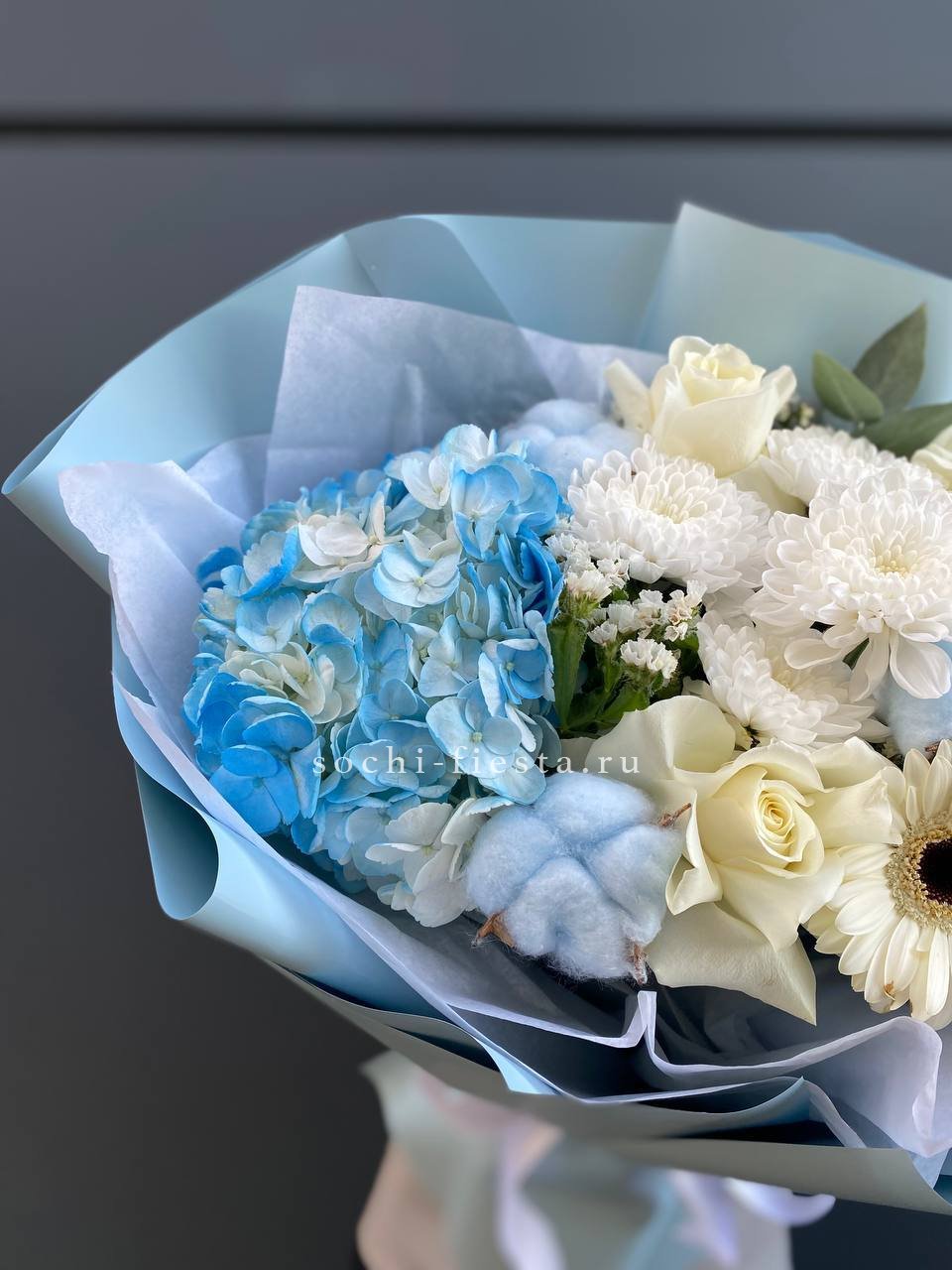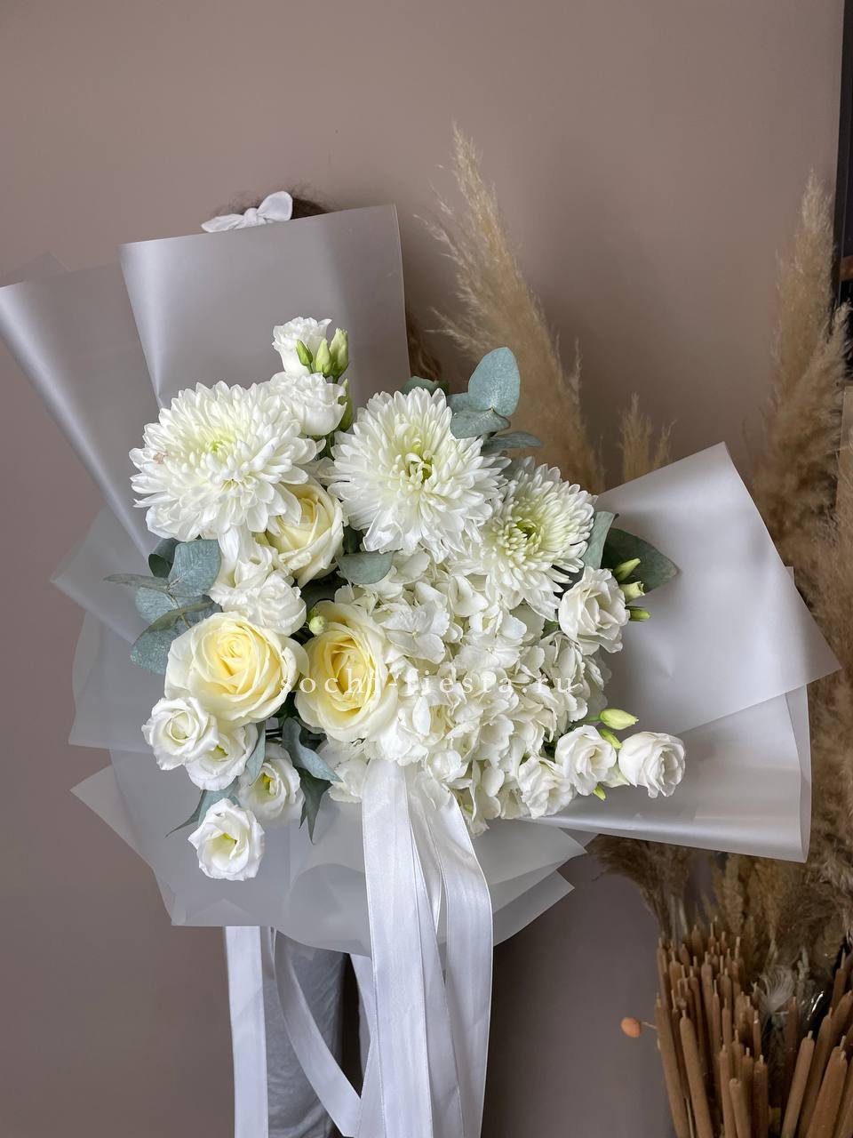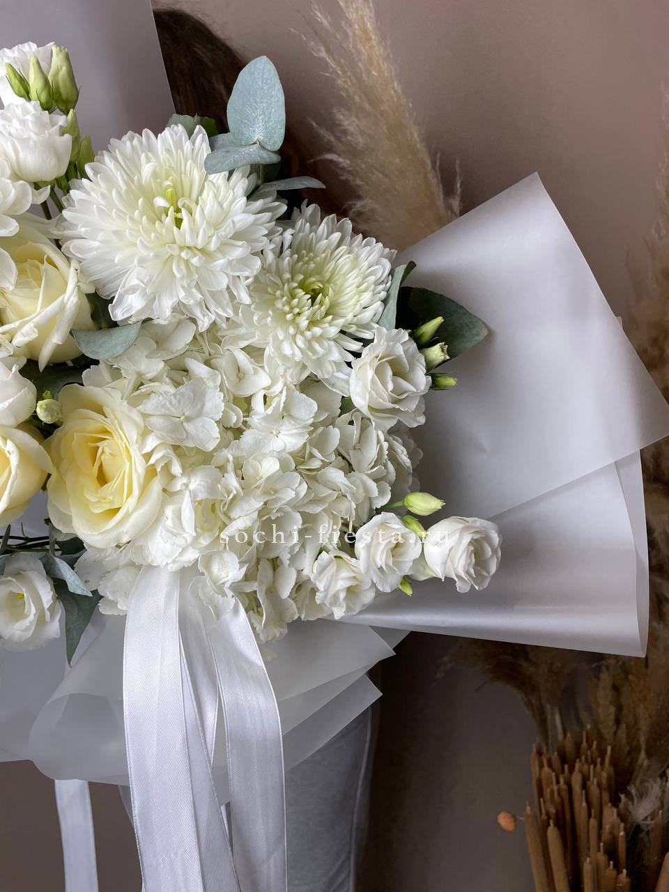 эвкалипт, гортензия, перо, кустовая роза, эустома, роза белая, диантус, упаковка.