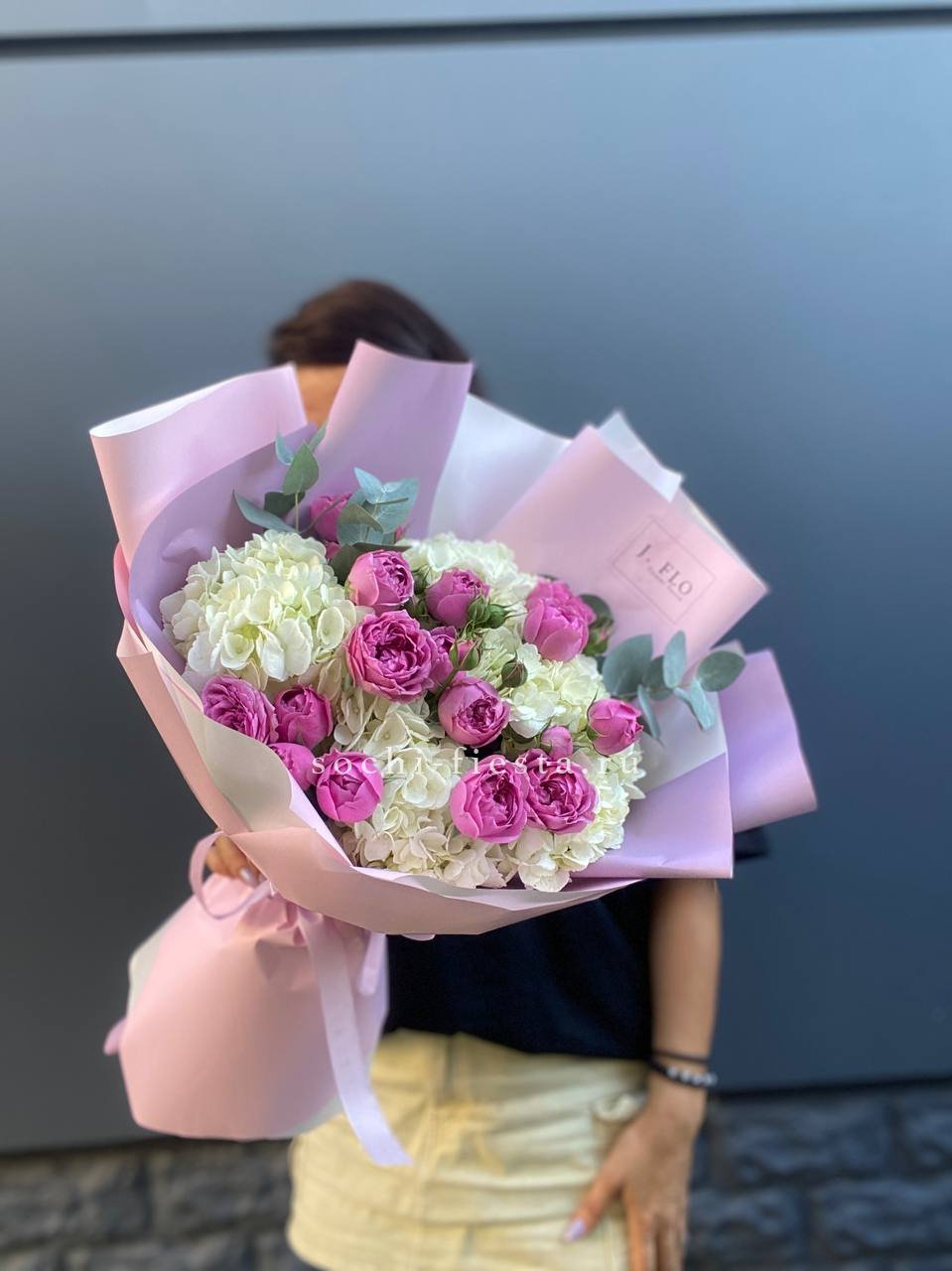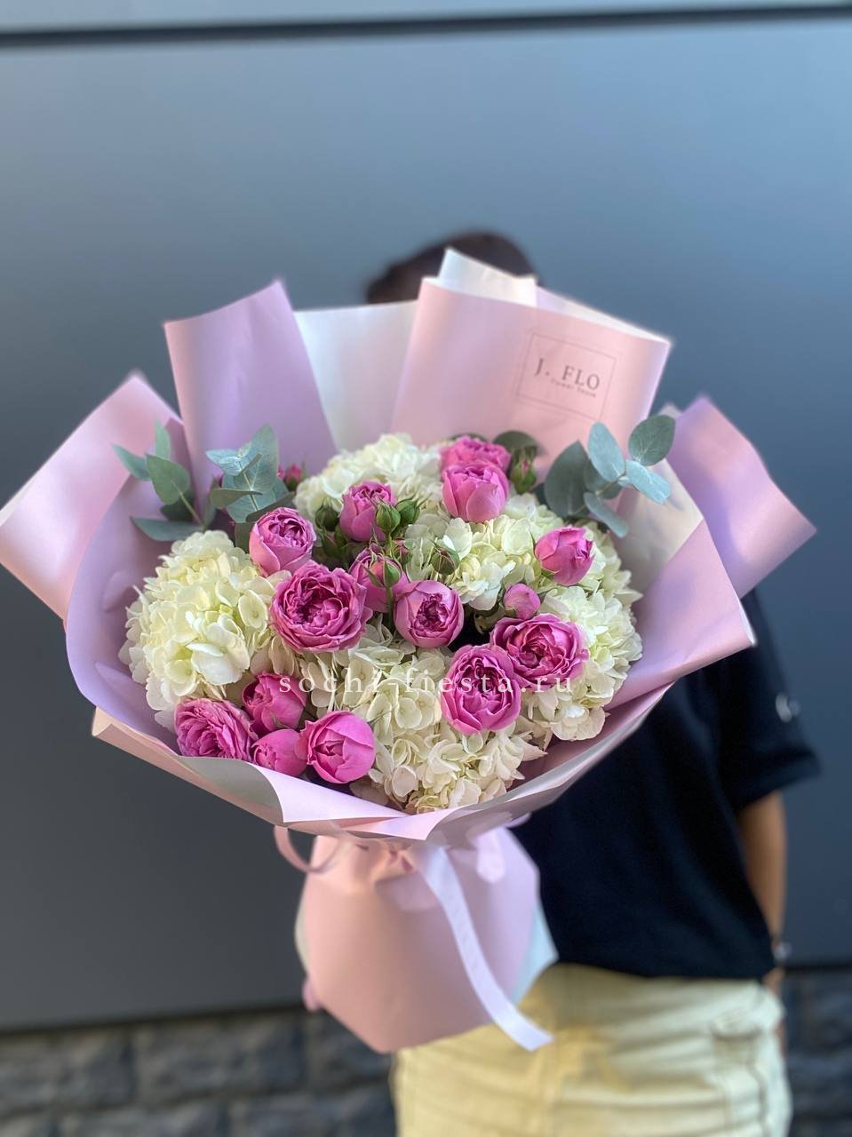 гортензия розовая, розы одноголовые, эустома, эвкалипт, лента, дизайнерская упаковка.