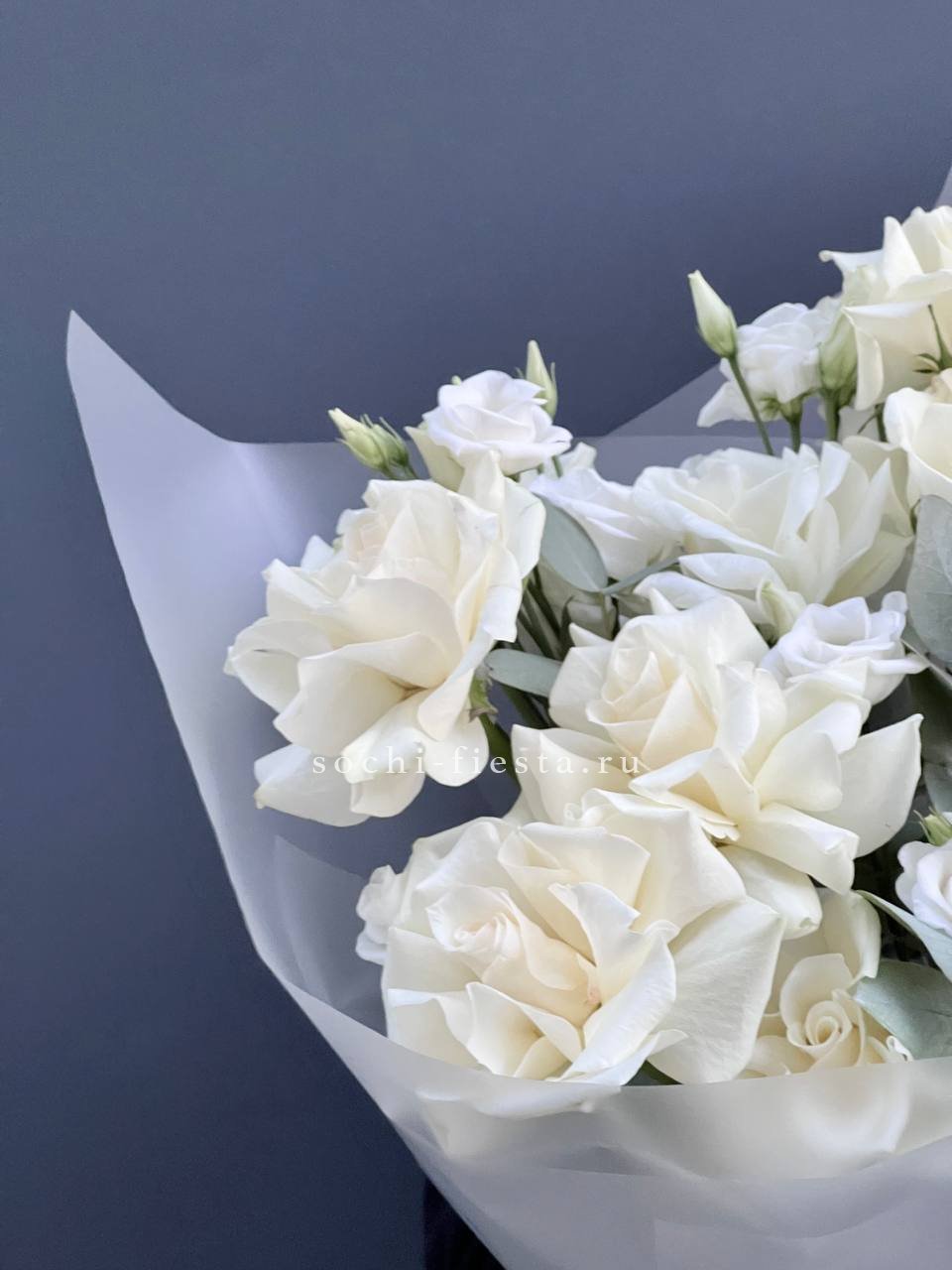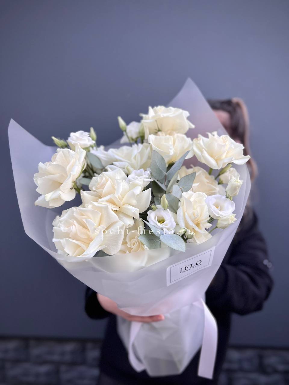 Пышная гортензия задаёт мягкий объём, а розы и эустома создают воздушную текстуру по краям. Веточки эвкалипта добавляют свежести и завершают композицию естественными линиями.