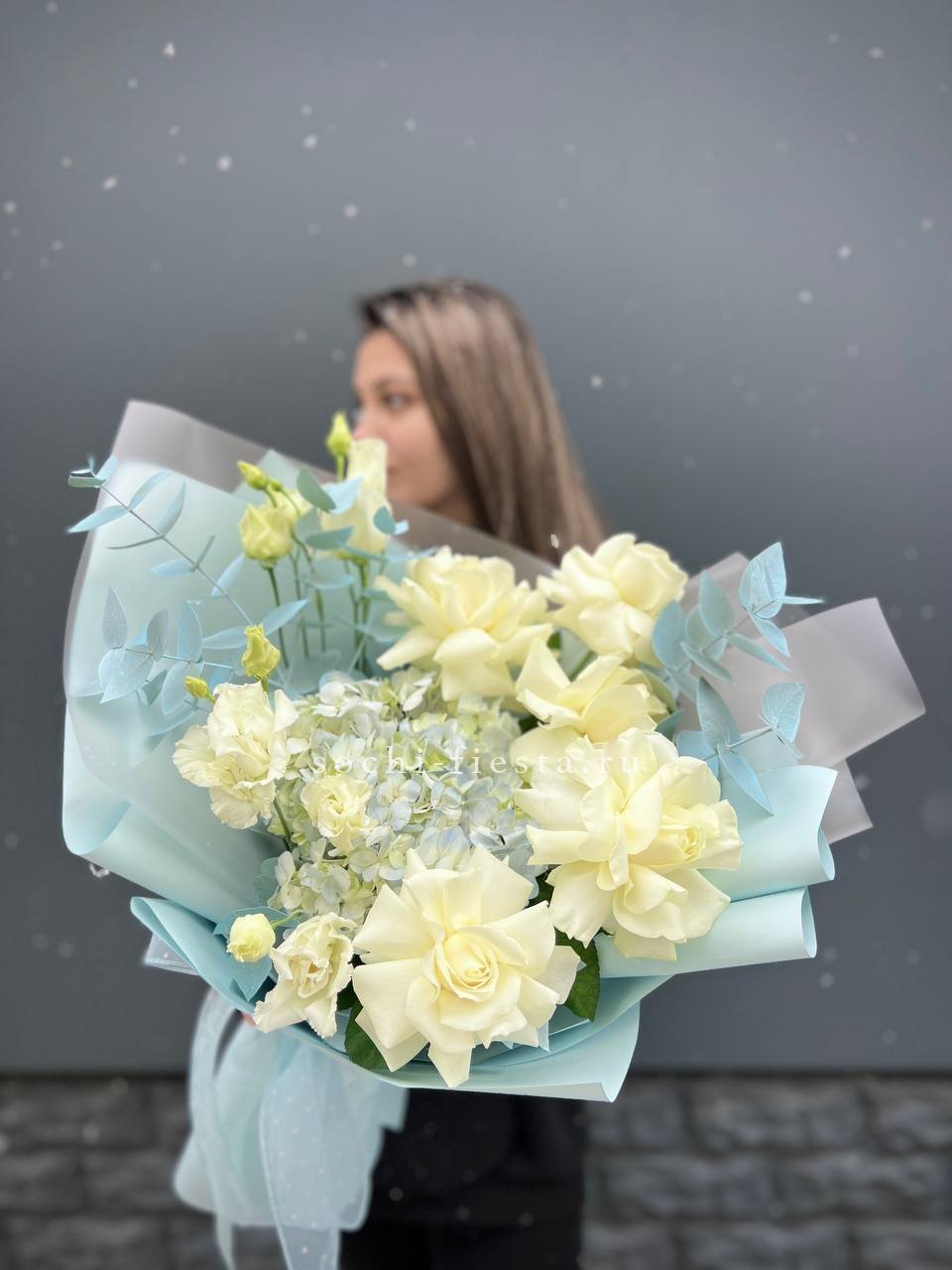 гортензия, эустома, белые французские розы, эвкалипт, авторское оформление.
