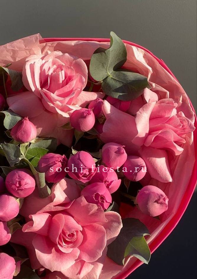 пионовидные розы, розовые пионы, диантусы, эвкалипт, лента, дизайнерская упаковка.