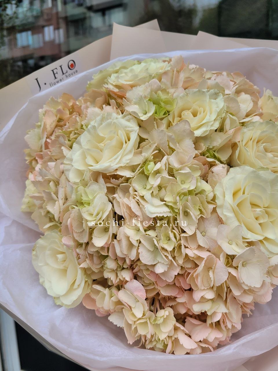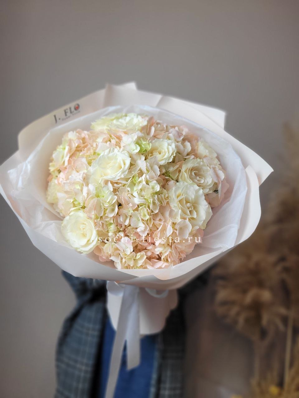 розы, гортензия, альстромерии, маттиола лента и дизайнерская пленка.