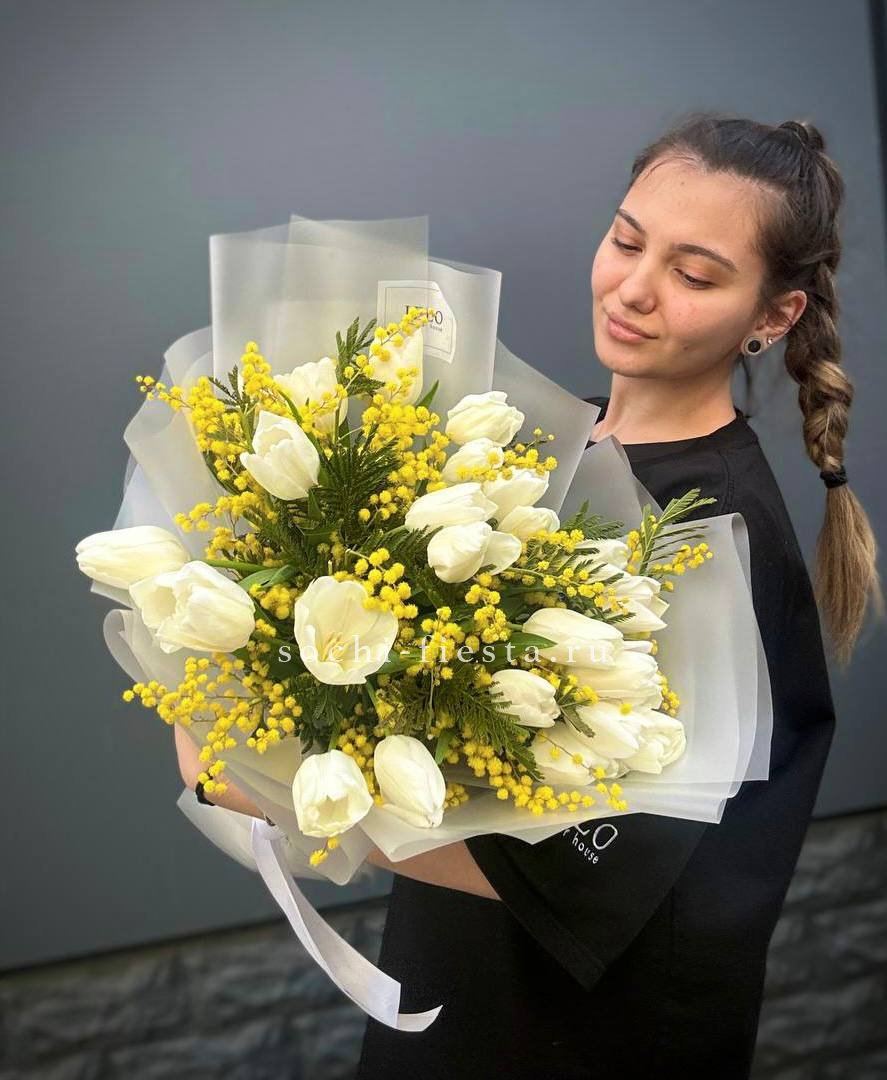 тюльпаны 25шт, мимоза, оформление.