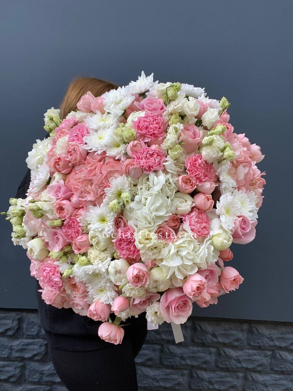 Масштабная композиция с пионами, эустомой и розами разворачивается во всей красе. Хризантемы и гортензия создают впечатляющее присутствие, которое преображает пространство вокруг.