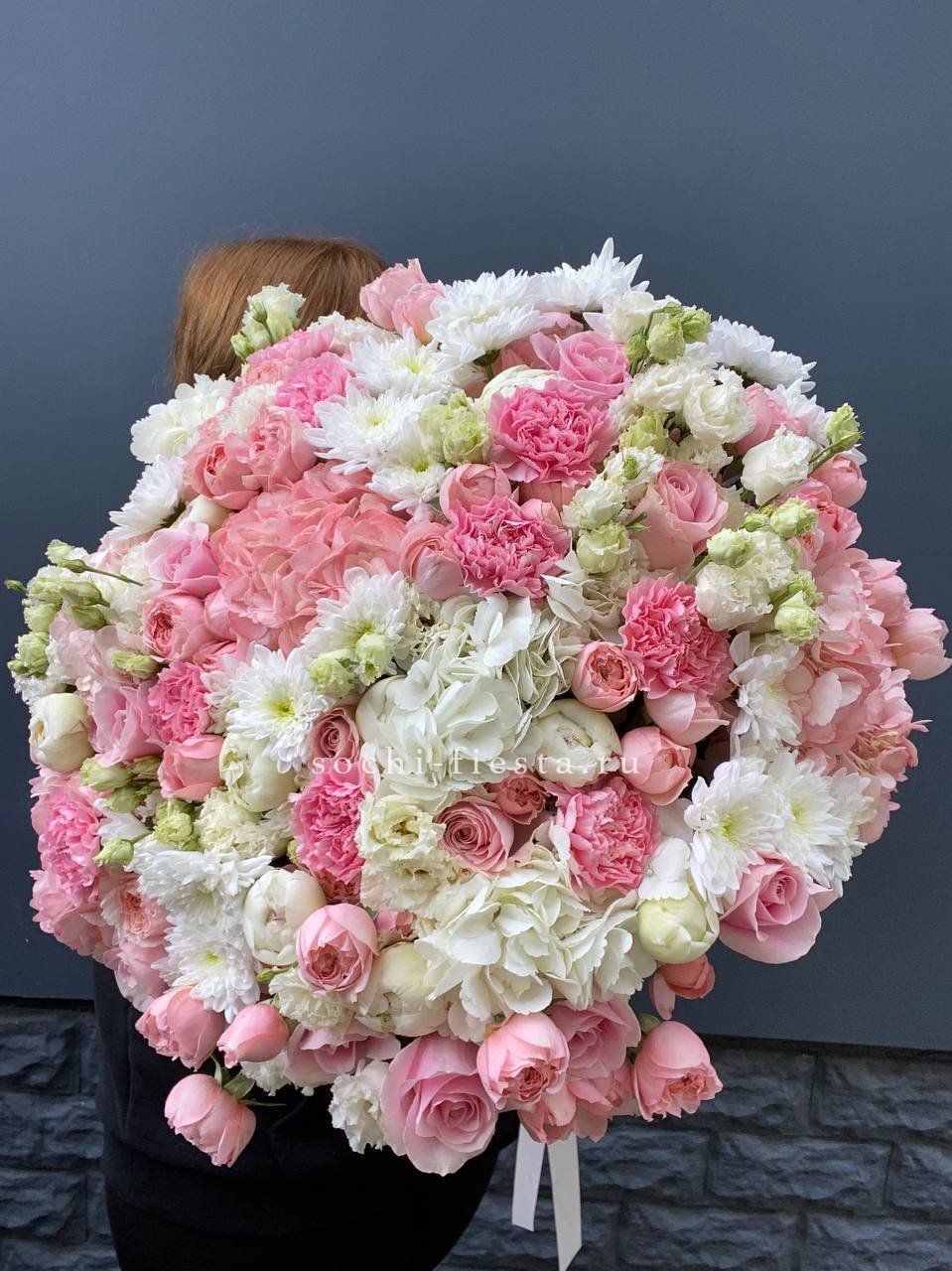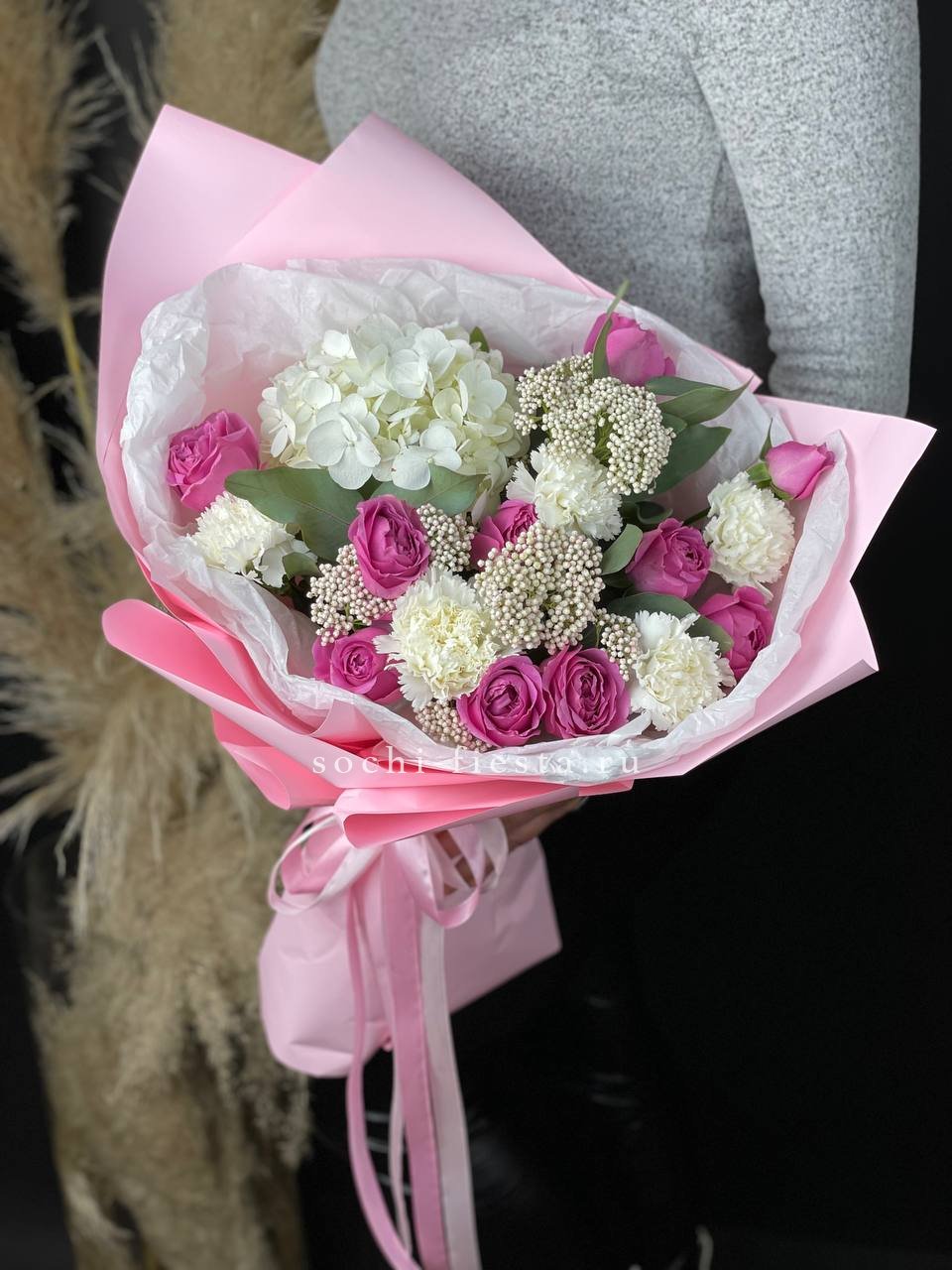 хризантема, гортензия, розовая роза, эустома, пионы ( может меняться, в зависимости от сезона), бомбастик, диантус, лента.