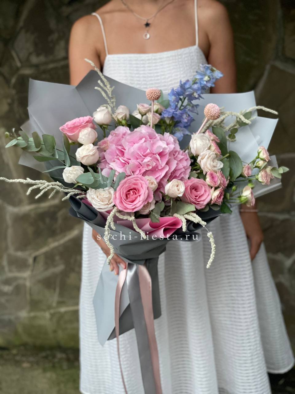 гортензия, кустовая роза, розовая роза, дельфиниум/маттиола/львиный зев, амарантус, эвкалипт или аналог, декор, корейская пленка, лента.