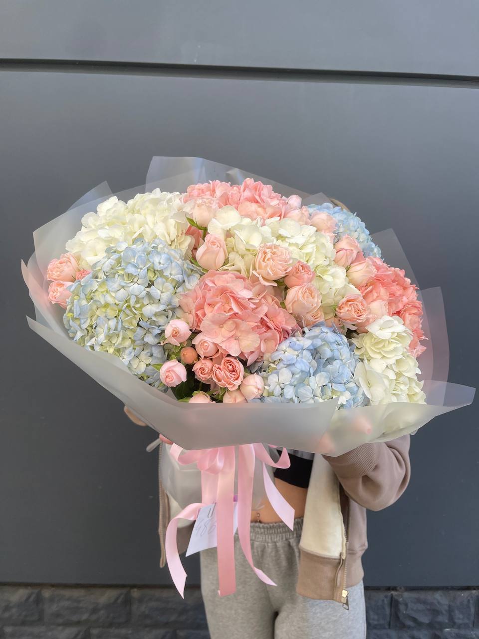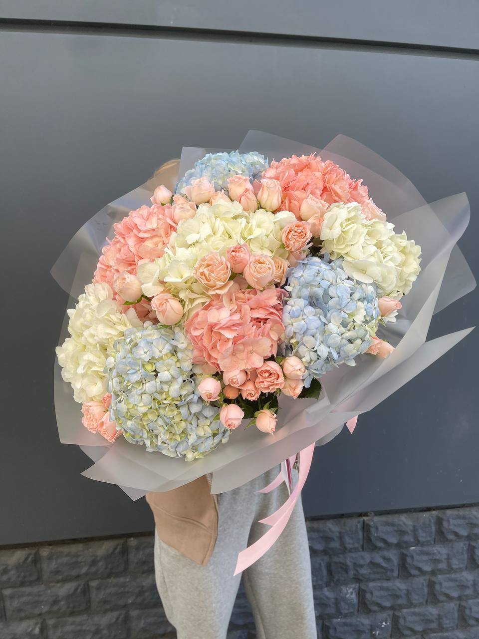 Этот пышный авторский букет напоминает нежное зефирное облако, в котором гармонично сочетаются объемные формы и изысканные оттенки. Композиция представляет собой микс из крупных соцветий гортензии и кустовых роз в пастельной гамме.