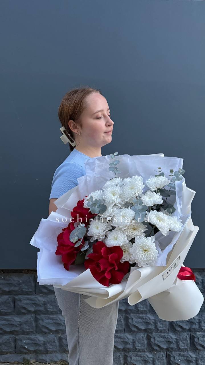 Красные розы и кустовая хризантема складываются в плотный ритмичный букет. Эвкалипт смягчает линии, а воздушная упаковка подчёркивает естественность формы.