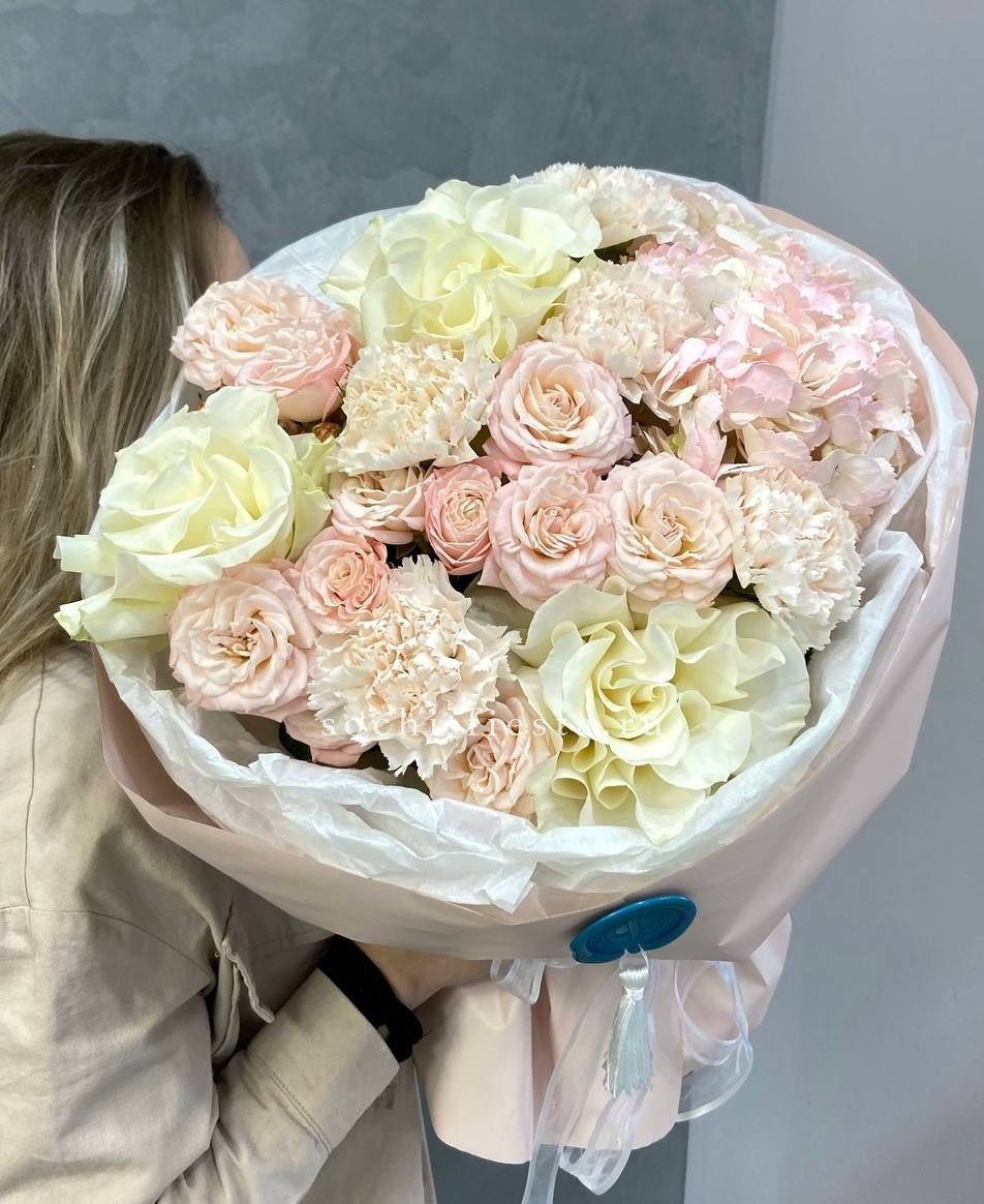 Пышная шапка из роз двух оттенков с объёмной гортензией и воздушным диантусом создаёт мягкий переход от белого к розовому. Бомбастик добавляет букету плотности, а эвкалипт освежает общую композицию. Универсальное решение для яркого поздравления.