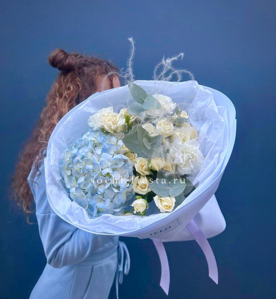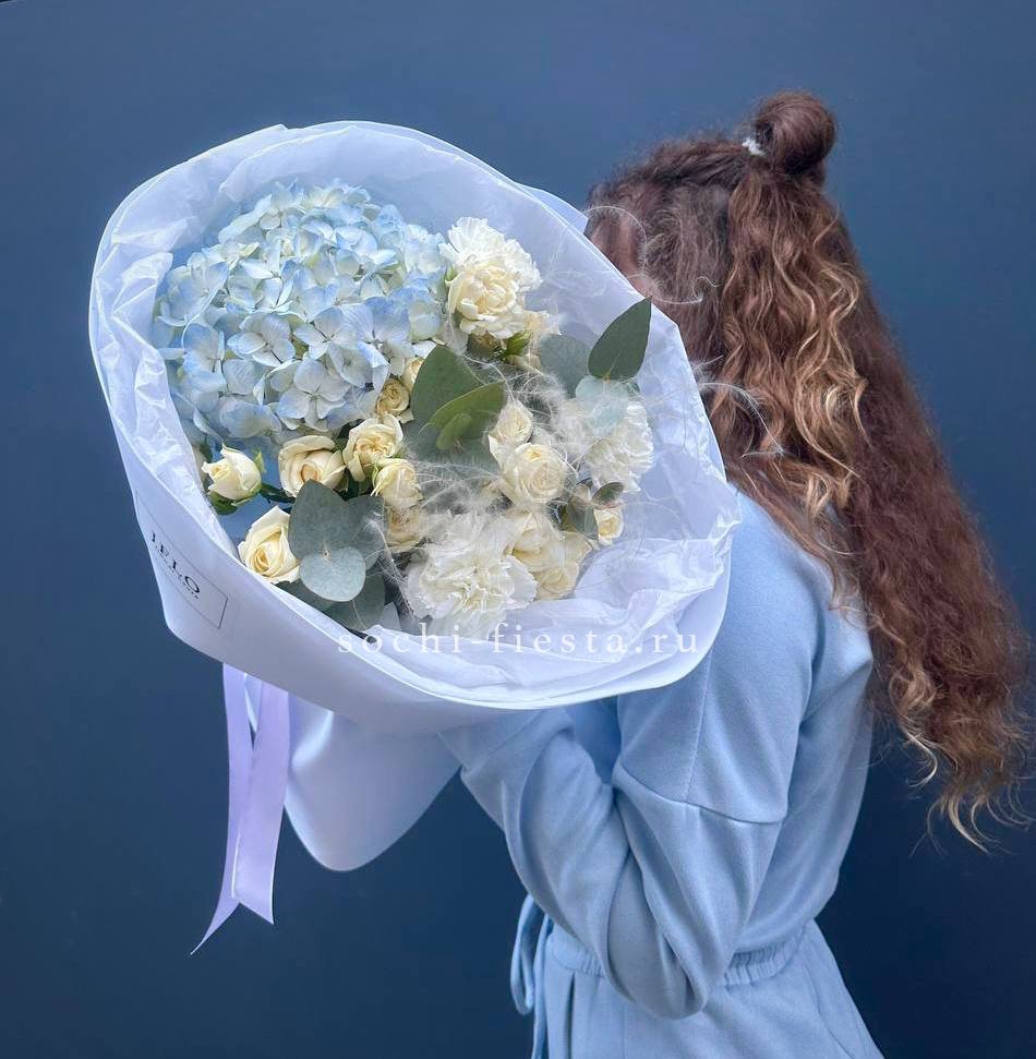 Букет объединяет хризантемы, диантусы, розы, эустому и гортензию в плотную композицию. Корейская пленка удерживает форму и создает графичный силуэт с четкими границами.
