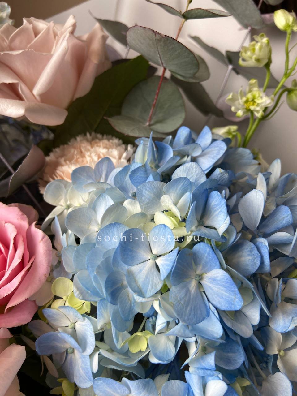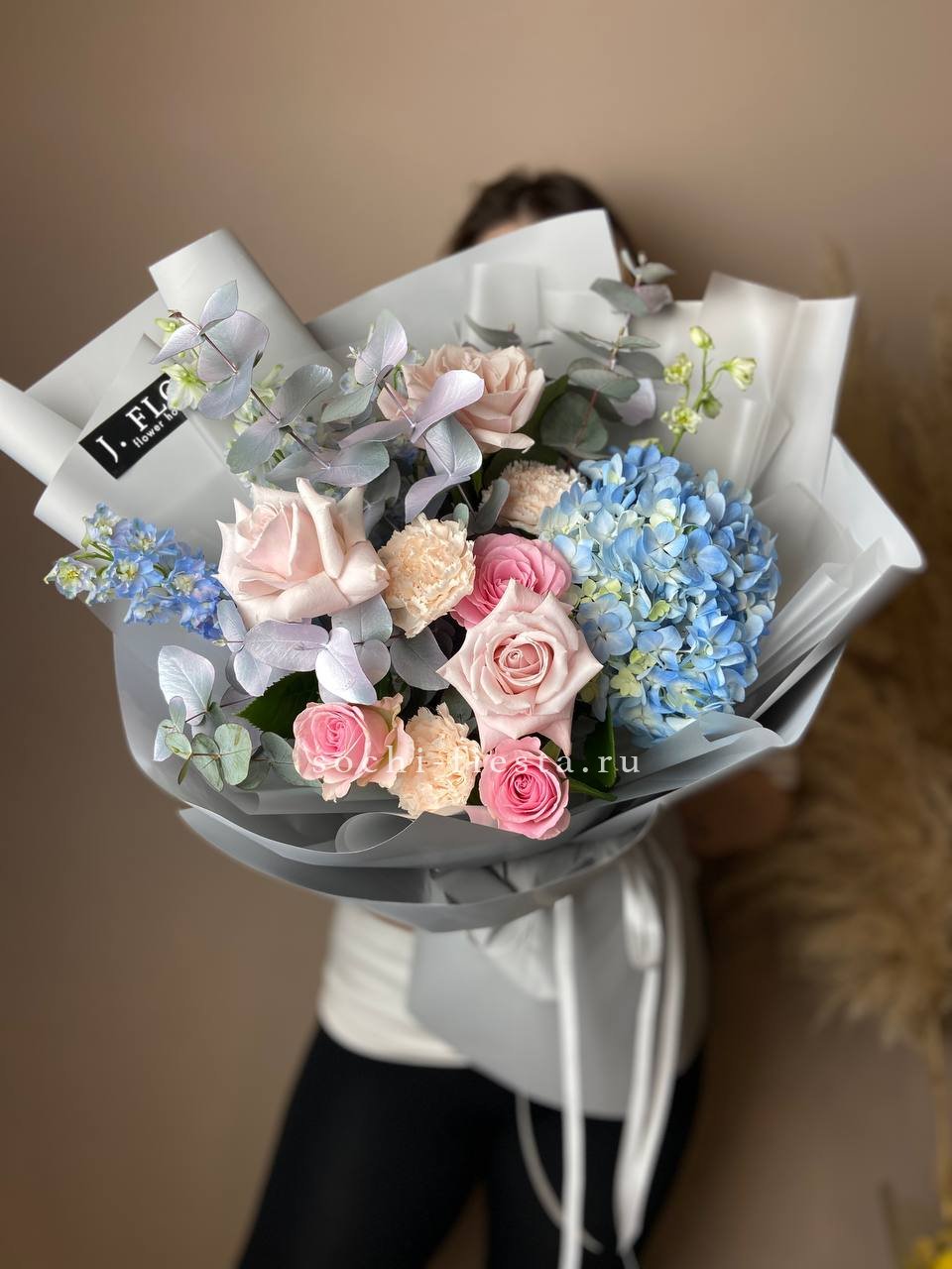 Лёгкая композиция с гортензией и гвоздикой дарит ощущение весеннего утра. Цветы подобраны так, что букет выглядит непринуждённо и свободно.