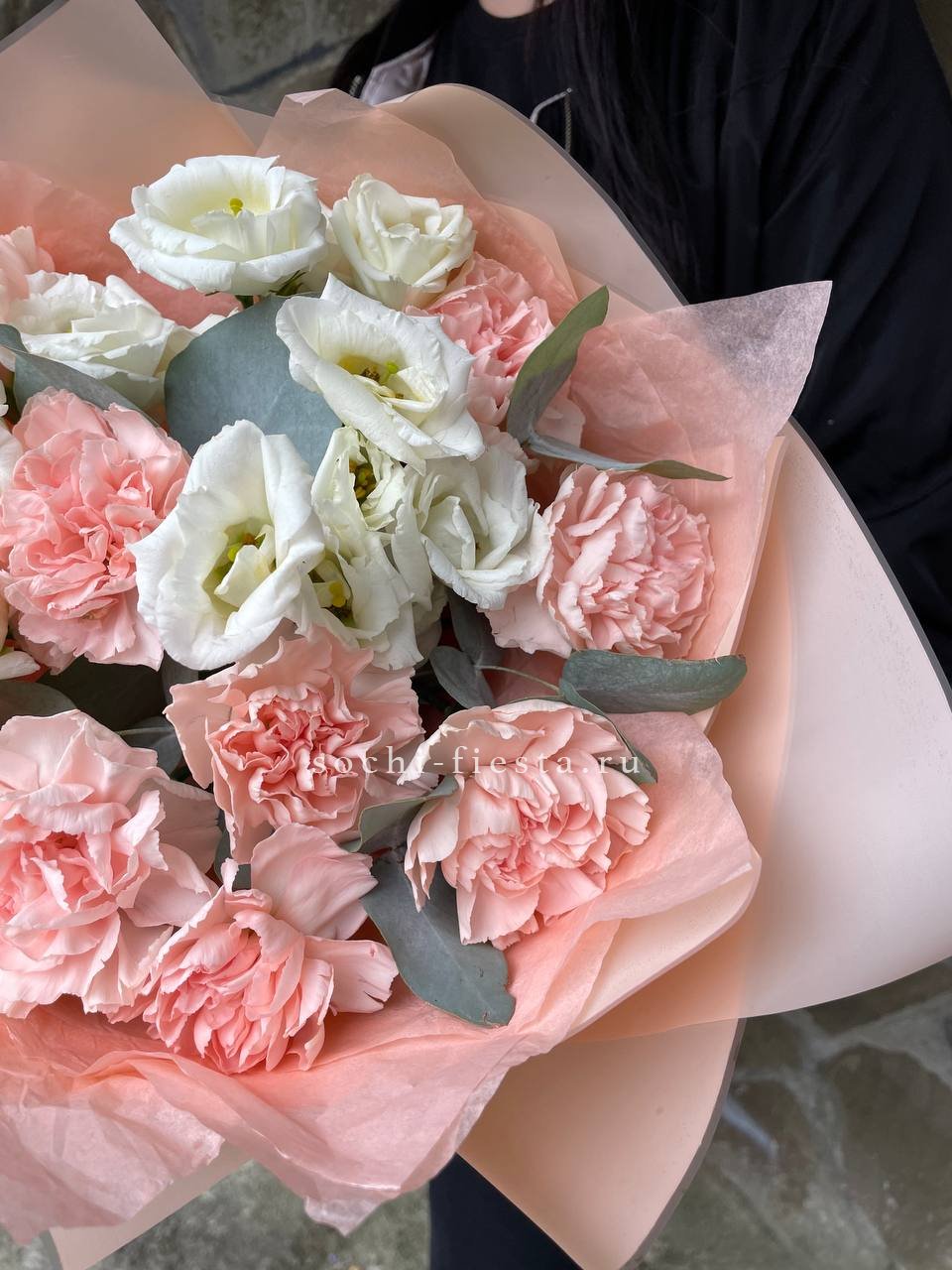 Белоснежная палитра с эустомой и пионовидными розами дополнена натуральным хлопком и эвкалиптом. Крупная композиция с выразительным присутствием и продуманной архитектурой. Форма держится долго благодаря плотности сборки.